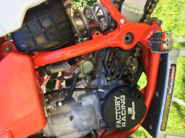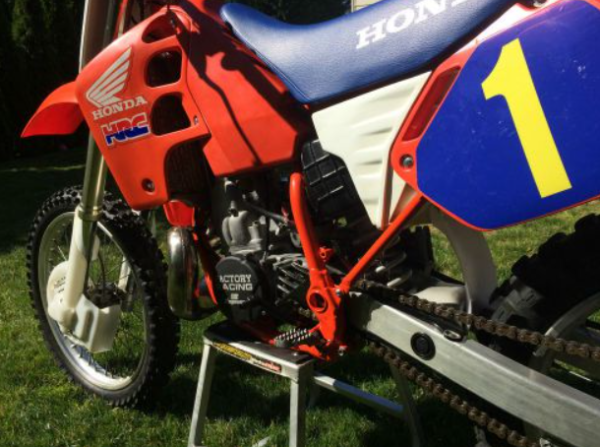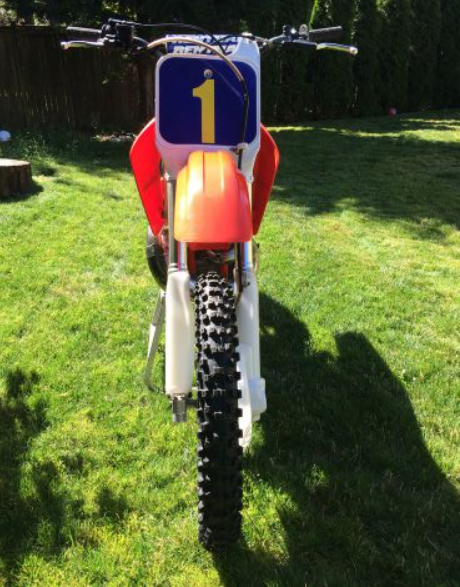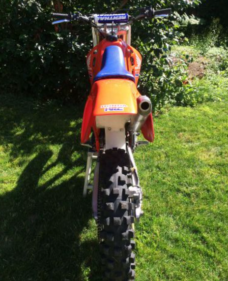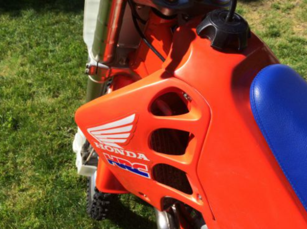 Purchased this CR500 from the original owner. Bike was a pretty clean, low hour, original bike, but was looking a little tired cosmetically from woods/trail riding. Bike has just gone through a nice refurb/restoration. Frame was powder coated Flash Red (orange) and added new UFO Flash Red (90 Orange) plastics to match. Also refurbished a nice 1991 CR500 fuel tank. Frame, UFO plastics, and OEM tank colors match perfectly, bike shows of OEM quality inspired by the 1980’s look! Added new transluscent colored OEM mud flap, fork guards, and DC plastics Honda Works HRC brake guard. Front UFO plate is white. Suspension was done w/ Race Tech Gold Valves and Race Tech springs (.46/kg front) and just serviced by EVO suspension; all new seals, bushings, oil, ect. New parts include: All Balls suspension linkage bearings, Scott grips, Renthal bar pad, racing reeds, NOS O’Neal racing pro style levers w/ OEM covers, OEM CRF450R bar clamps, air filter, CEET foam (stiff), nice repod seat cover, rear brake pads, OEM gas cap vent tube, Boyesen Factory stator/ignition cover and numerous OEM and aftermarket nuts/bolts. Bike has IMS wide footpegs, nice Renthal sprockets/ Renthal gold o-ring chain, Pro Circuit Platinum pipe w/ a few minor dents, FMF Powercore II silencer/spark arrestor, newer Dunlop MX51 front. Inner right clutch cover has been replaced, no water pump rot. When bike was disassembled everything was soda blasted, polished, ultrasonic cleaned, and greased. Anything that looked worn was replaced. Shined a flashlight in the exhaust port, cylinder and piston looked great, has good compression. Bikes been using Maxima 927 2 stroke oil. This is a very nice, clean, tight bike. Nothing was overlooked. This bike is ready to ride or take it to the next level and get some gold rims!